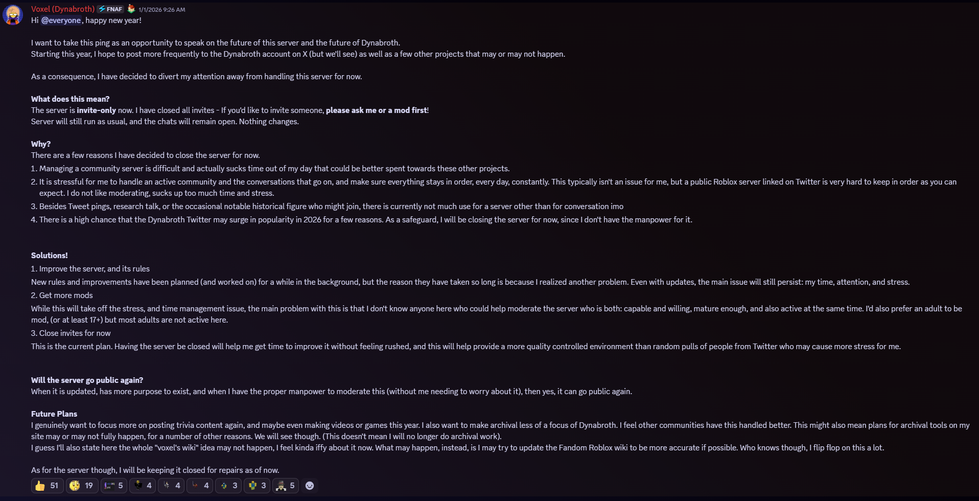 1/1 // As previously mentioned, Dynabroth server is closed to the public for now. Please DM for an invite if you want one. Read this explanation for more info. There's some other reasons not stated here, but we can save that for when the blog comes up some day.